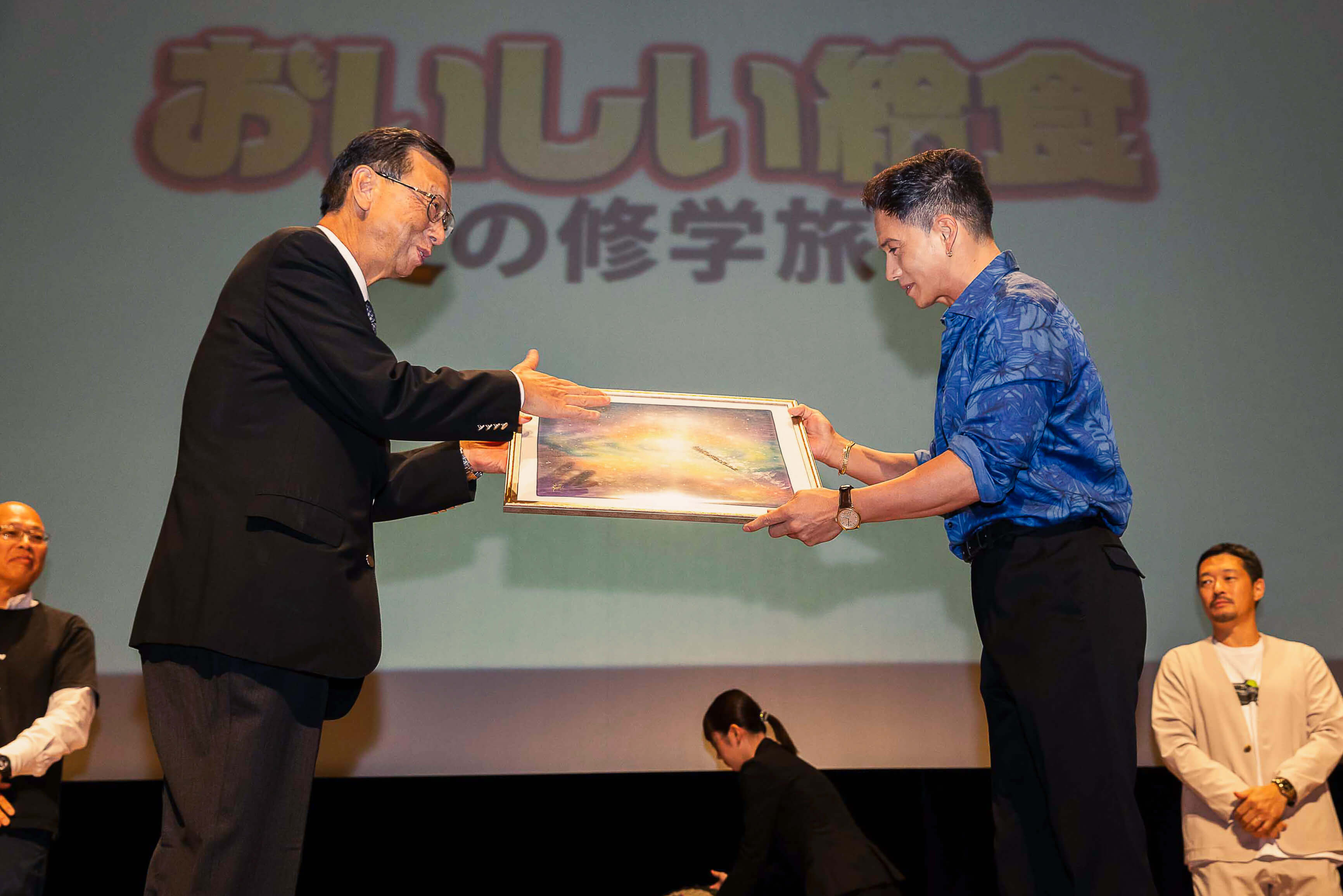 市原らがステージに登場すると、会場は大歓声に包まれる。トークショーが始まる前に、上田東一花巻市長より映画のロゴが入った花巻傘と宮沢賢治にちなんだ絵柄が施されているハンカチの記念品が贈呈された。花巻市長は、「花巻でロケをしたというご縁で、先行上映をしていただくことについて御礼を申し上げたい」と3人へ感謝の言葉を贈ると共に、「花巻のロケ地での場面も登場します。そこで描かれる“おいしい給食”の場面を楽しみに拝見させていただきたいと思います」と本作への期待のコメントを述べた。