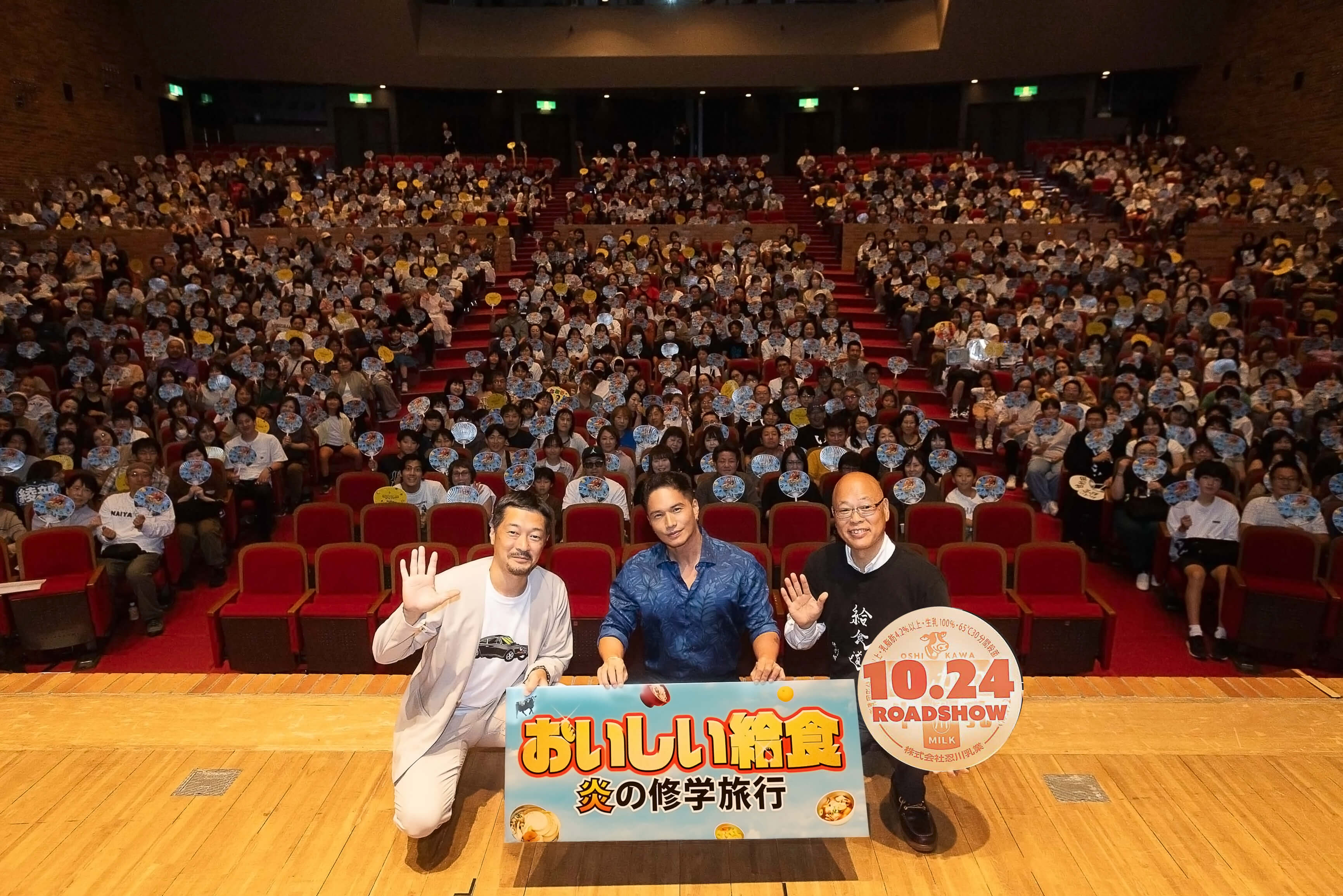 この度、映画『おいしい給食 炎の修学旅行』の10月24日(金)の公開に向けて、舞台挨拶行脚「炎の全国キャラバン」が本作の舞台、青森・岩手を皮切りにスタートいたしました。9月28日(日)には花巻市文化会館にて総勢900名におよぶ舞台挨拶付き先行上映会が開催され、市原隼人、綾部真弥監督、岩淵規プロデューサーが登壇いたしました。